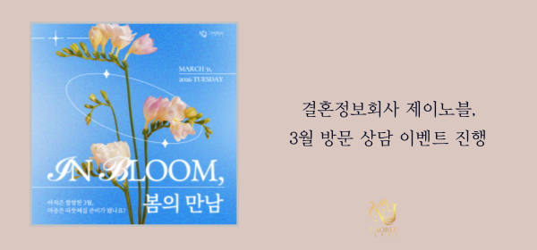 결혼정보회사 제이노블이 3월 방문 상담 회원을 대상으로 ‘In Bloom, 봄의 만남’ 이벤트를 진행한다고 밝혔다. 이번 행사는 봄 시즌을 맞아 새로운 인연을 준비하는 미혼 남녀에게 상담 혜택을 제공하기 위해 기획됐다.